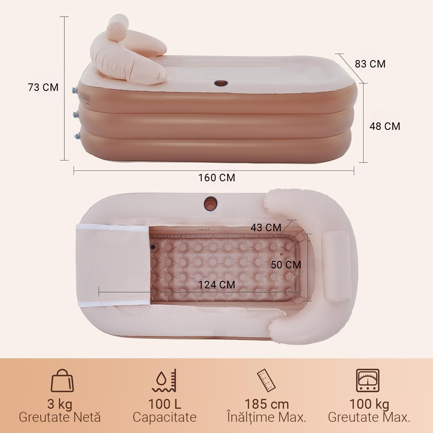 Cu dimensiuni de 160 cm x 83 cm x 48 cm, această cadă oferă suficient spațiu pentru o persoană adultă, doi copii sau chiar pentru un adult și un copil simultan. Adâncimea de 48 cm permite o imersiune completă a corpului, asigurând o experiență de relaxare profundă.