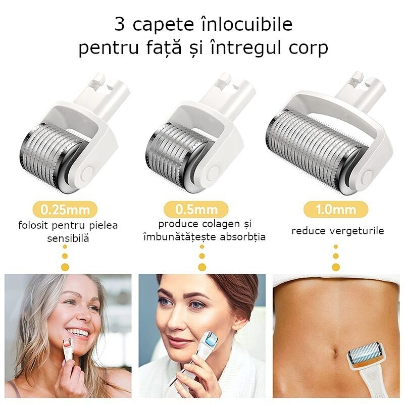 3 capete inlocuibile: Rola vine cu trei capete diferite, fiecare avand lungimea și densitatea acelor ajustabile, pentru a se potrivi mai bine nevoilor specifice ale pielii de pe diferite zone ale feței și corpului.