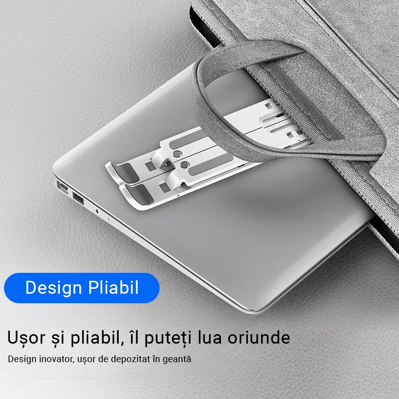 - Ușor și Portabil: Cu un design pliabil și o greutate redusă, acest suport este ideal pentru persoanele mereu în mișcare, care au nevoie de un accesoriu de laptop portabil și funcțional.