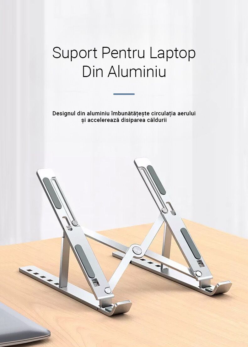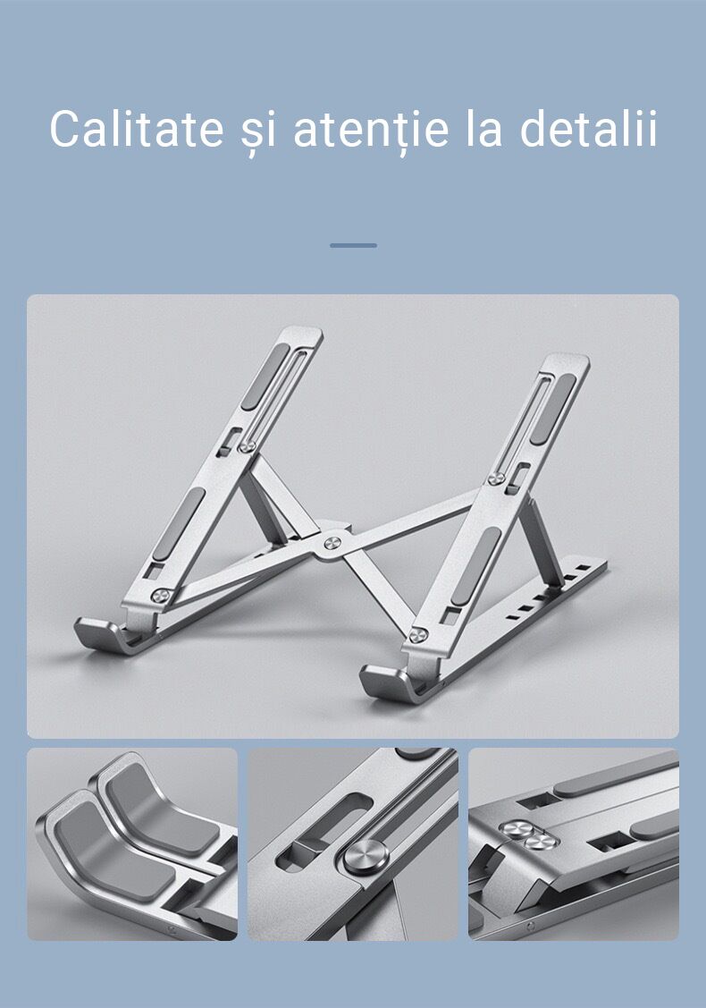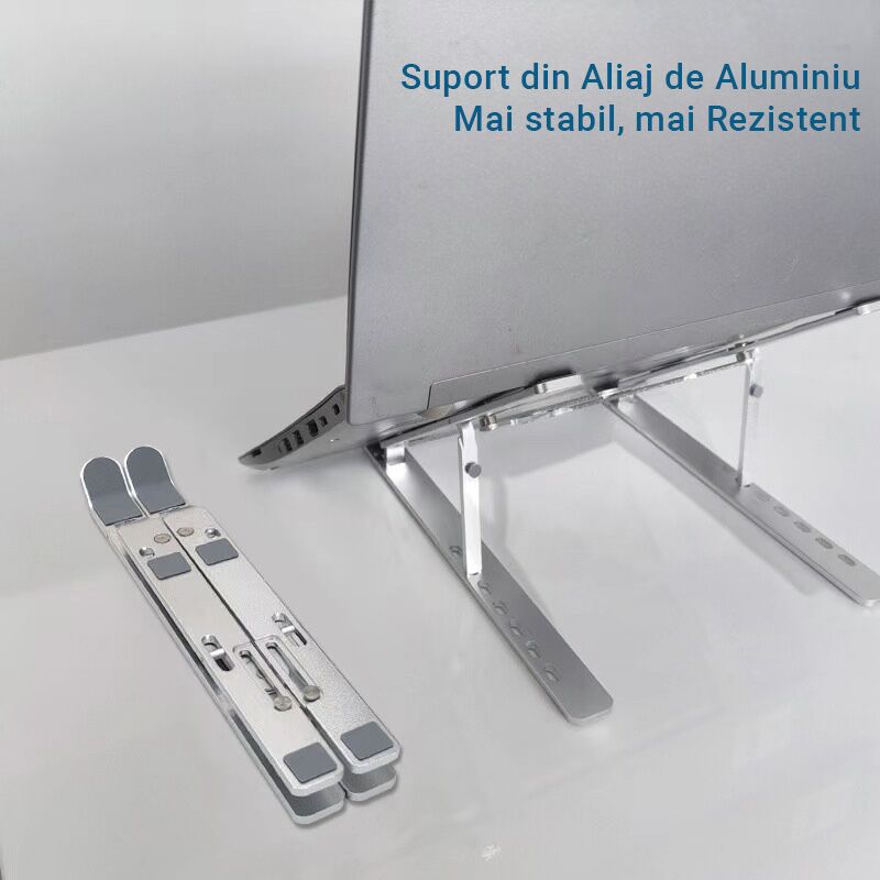 - Construcție din Aluminiu Premium: Fabricat din aluminiu de înaltă calitate, suportul oferă nu doar un design elegant și modern, ci și durabilitate. Aluminiul ajută și la disiparea căldurii, asigurând o răcire mai eficientă a laptopului în timpul utilizării.