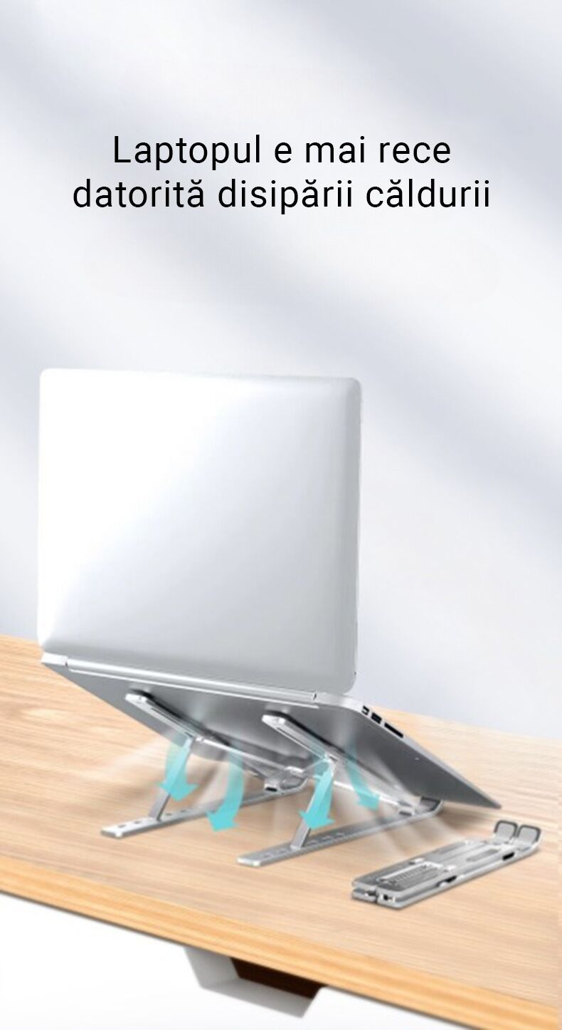 - Reglabil pe Înălțime: Suportul permite ajustarea pe mai multe niveluri de înălțime, oferind flexibilitate în funcție de nevoile tale ergonomice. Poți ridica laptopul la nivelul ochilor pentru a preveni durerile de gât și spate, îmbunătățind postura și confortul în timpul utilizării pe termen lung.